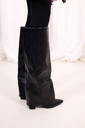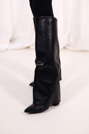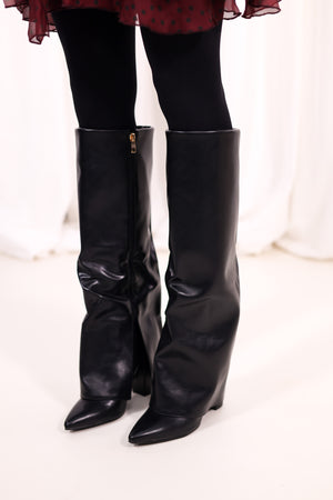 Ces bottes à la silhouette affirmée apportent immédiatement du style à n’importe quelle tenue. Leur coupe haute et légèrement plissée offre un look moderne et original, tout en donnant de l’allure à la démarche.