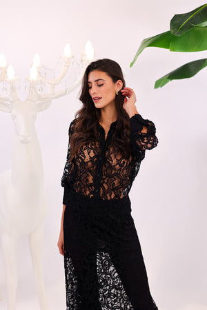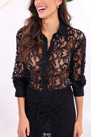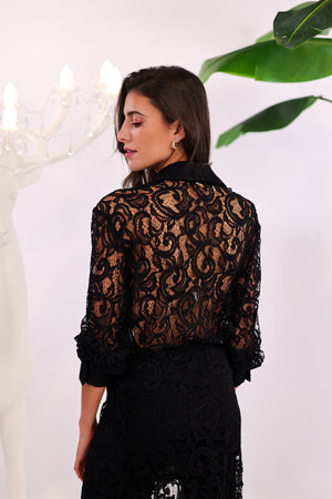 • Body chemise entièrement réalisé en dentelle noire au motif délicatement travaillé.