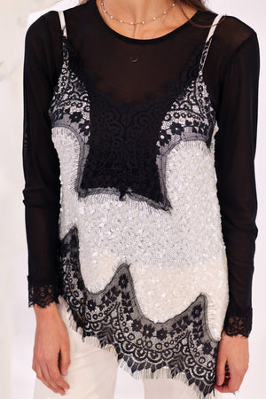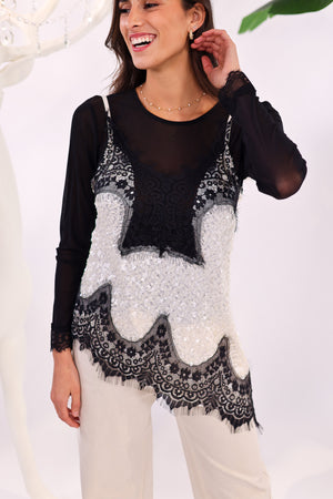 Faites briller vos tenues avec cette blouse entièrement recouverte de sequins cousus, une pièce spectaculaire qui mêle glamour, finesse et modernité. Son jeu de transparence et ses détails en dentelle apportent une touche sophistiquée tout en restant très féminine.
