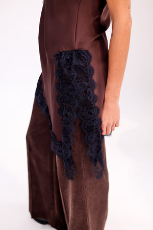 Cette blouse élégante mêle subtilement sensualité et sophistication. Conçue dans un satin chocolat ultra-doux au tombé fluide, elle est rehaussée de délicates incrustations de dentelle noire disposées en diagonale pour un effet graphique et raffiné.