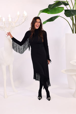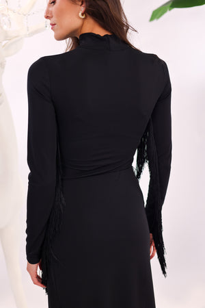 Ce body se distingue par ses longues franges placées le long des manches, créant un effet spectaculaire à chaque geste. Son col montant apporte une touche moderne et élégante, tandis que sa coupe apporte en valeur la silhouette avec subtilité. Idéal pour un look glamour et affirmé, il se porte aussi bien en pièce forte qu'en base chic pour un ensemble coordonné.