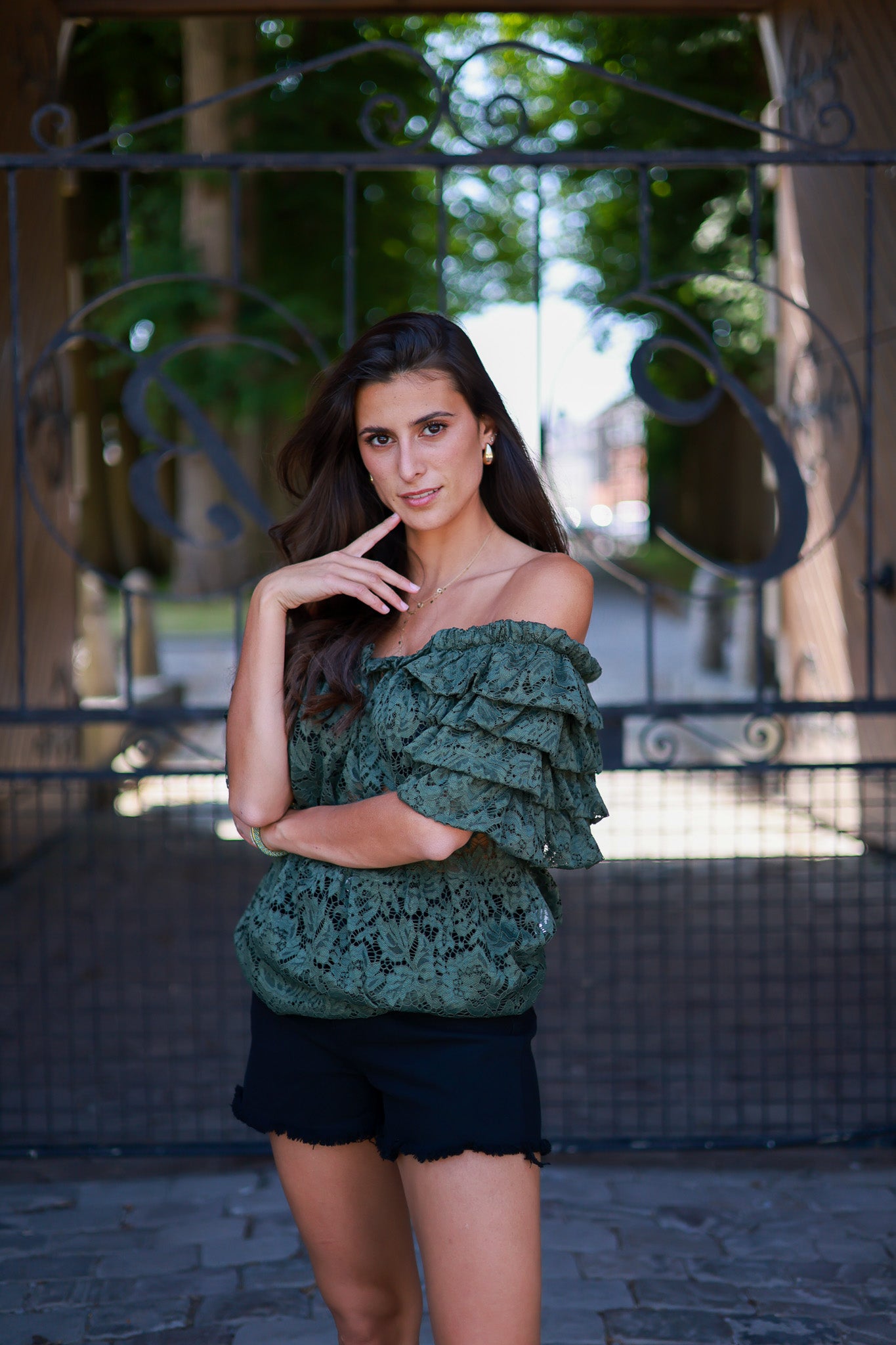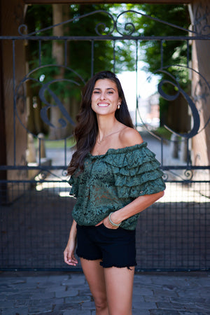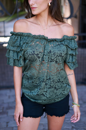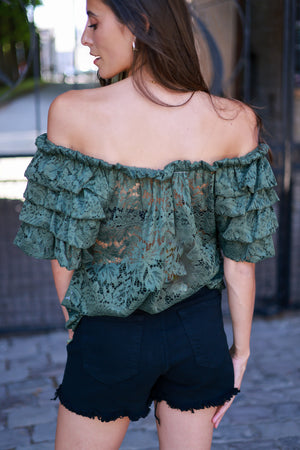 Blouse en dentelle kaki à épaules dénudées