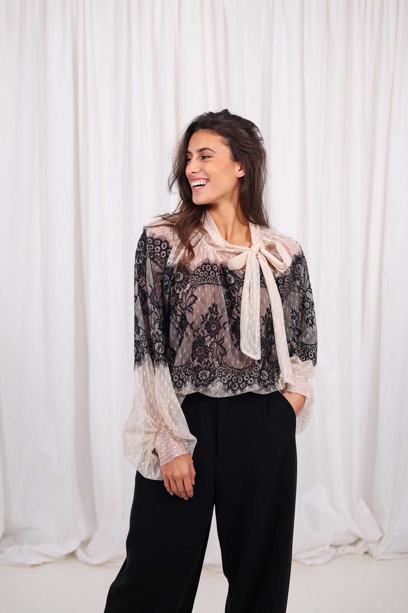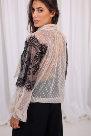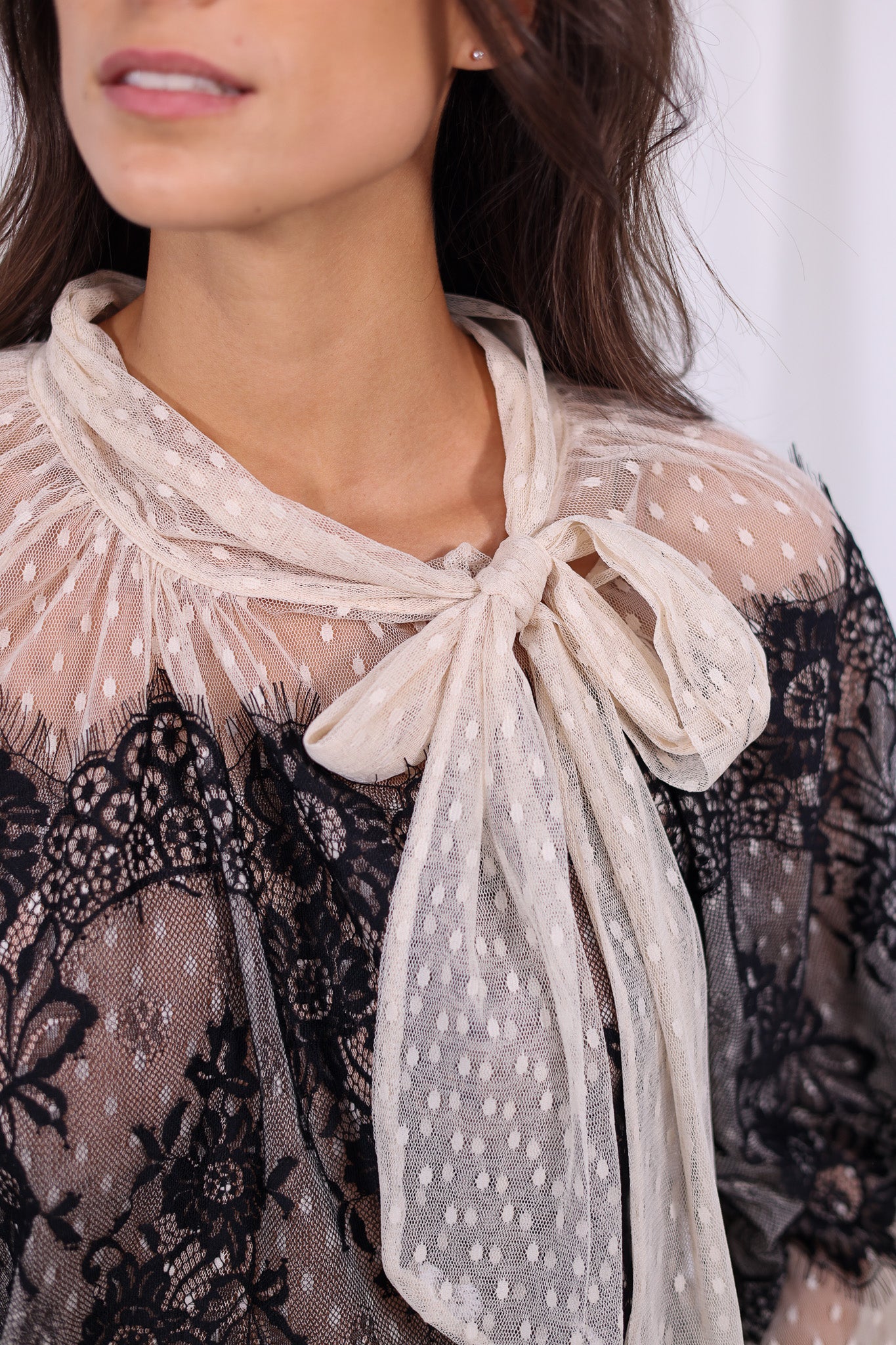 Découvrez une blouse en dentelle fine et délicatement transparente, offrant un sublime jeu de matières. Son voile crème à pois s’associe à de larges bandes de dentelle noire florale, créant un contraste raffiné et ultra-séduisant.