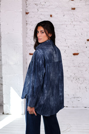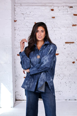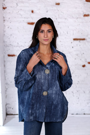 Une chemise oversize en denim effet délavé sublimée par de magnifiques boutons dorés texturés. Un détail précieux qui transforme une chemise casual en véritable pièce statement. Elle se porte aussi bien de jour avec un jean brut que le soir avec un pantalon noir ou une jupe élégante.