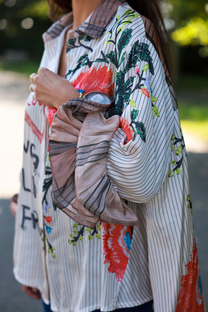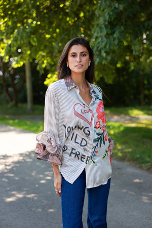 Coup de cœur assuré pour cette chemise oversize à la coupe fluide et au look arty assumé ! On adore son mélange d’imprimés audacieux : rayures fines, fleurs corail vibrantes, jeux de carreaux doux et touches de texte brodé à l’avant qui apportent une note rebelle et romantique à la fois. Les manches longues sont détaillées de volants contrastants, pour une allure ultra féminine et pleine de caractère.