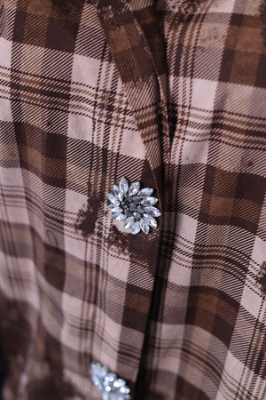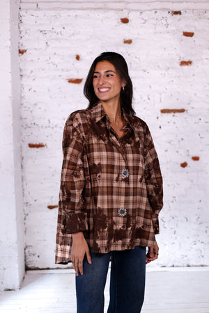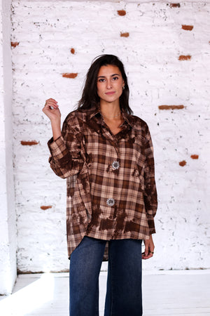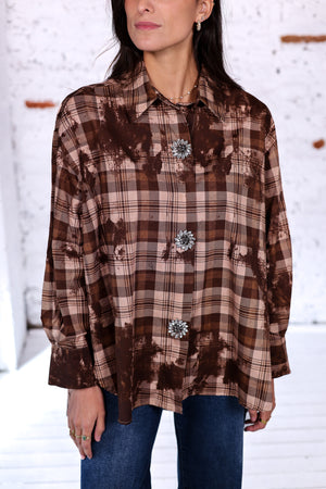 Une version douce et chaude du carreau avec ce coloris marron élégant. Chic et confortable, cette chemise oversize se distingue par ses boutons bijoux qui illuminent le look. Parfaite avec un denim clair ou un pantalon fluide beige.