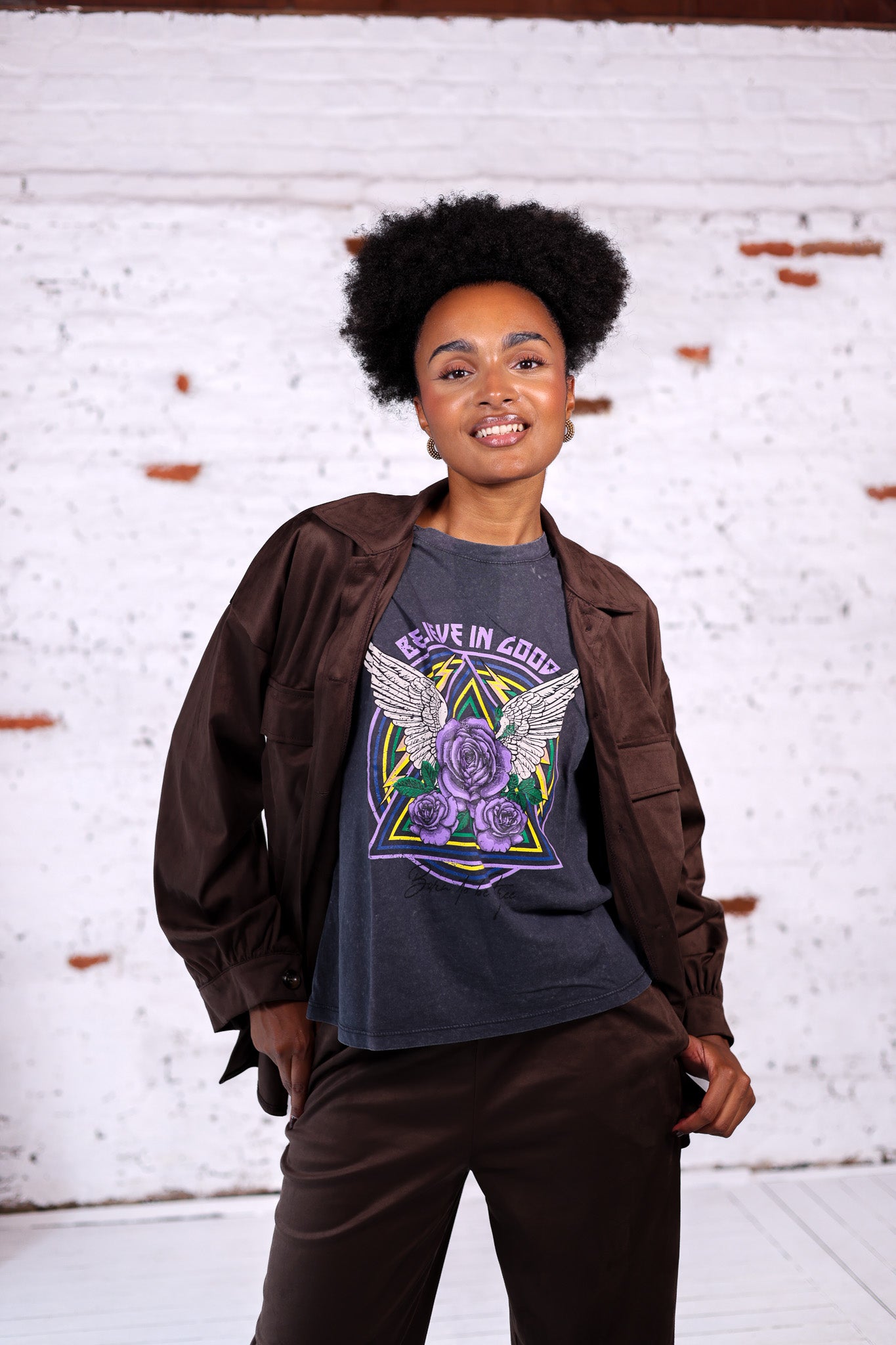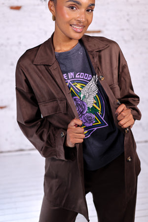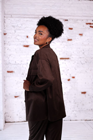 Chemise fluide à l’effet suédine chocolat. Son tombé élégant et sa coupe oversize apportent une allure chic et décontractée, idéale à porter aussi bien en total look qu’en version casual.