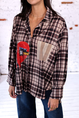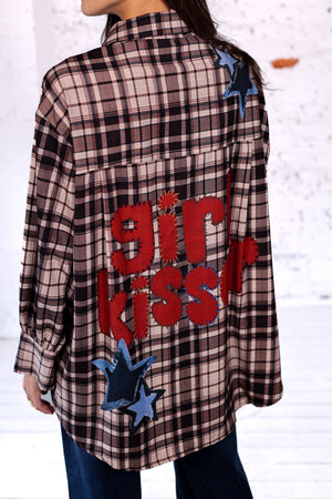 Une chemise oversize au style unique qui revisite l’incontournable carreau avec une touche street et arty. Sur le devant, un grand cœur rouge imprimé « Looked so cool » vient dynamiser la pièce, tandis qu’au dos, les patchs colorés « Girl Kiss » et les étoiles en jean apportent une allure résolument tendance. Facile à porter, elle se mixe aussi bien avec un jean slim qu’avec un pantalon plus habillé pour un look décontracté-chic.