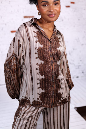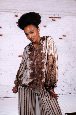 Cette chemise fluide au motif raffiné marron et beige apporte une touche chic et élégante à vos looks. Sa coupe ample et légère la rend agréable à porter au quotidien comme en soirée. Taille unique, elle convient jusqu’au 42 et se marie parfaitement avec son pantalon assorti pour un total look harmonieux et tendance.