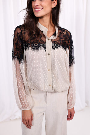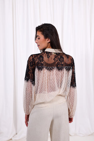 Élégante et féminine, cette chemise mêle délicatement transparence, dentelle et légèreté. Ses manches bouffantes en plumetis et son empiècement en dentelle noire apportent une touche chic tout en restant facile à porter au quotidien. Une pièce coup de cœur qui sublime instantanément n’importe quel look.