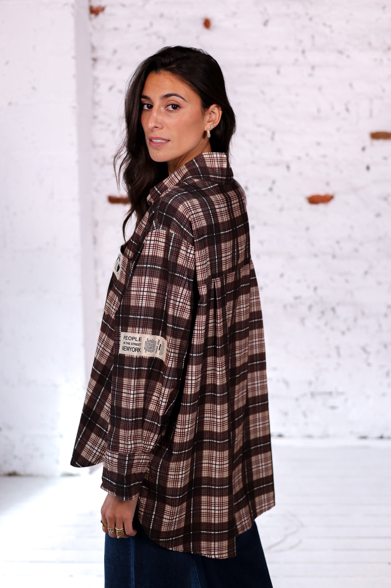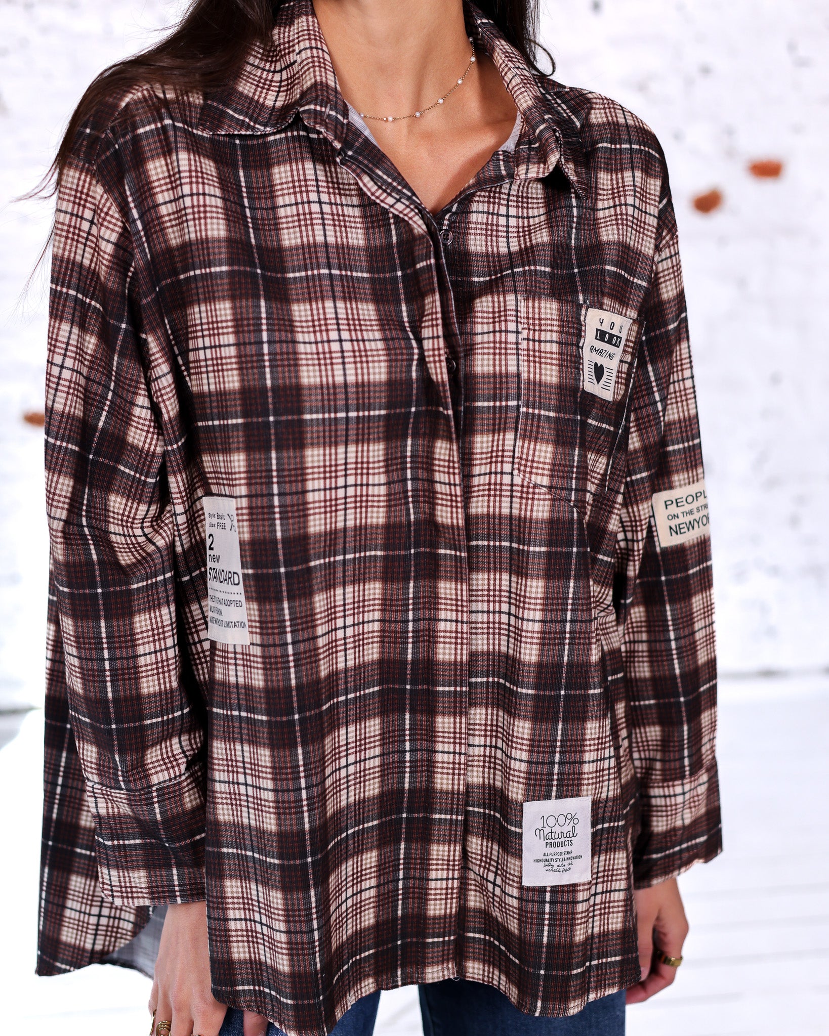 Chemise oversize à carreaux dans les tons marron et beige, agrémentée de patchs imprimés pour une touche urbaine et tendance. Sa coupe ample et confortable en fait une pièce idéale pour un look décontracté et stylé.