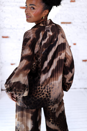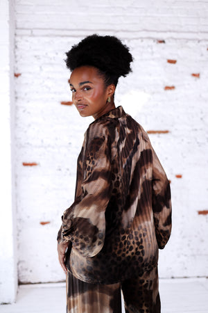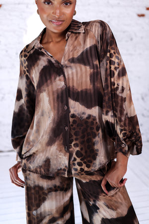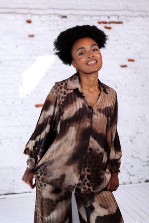 - Chemise fluide imprimée marron, beige et noir façon animalier/abstrait