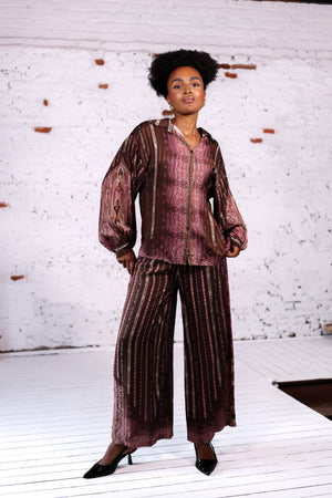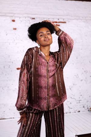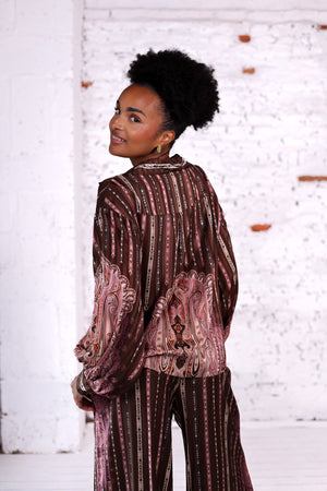 On adore son esprit bohème-chic et son imprimé qui mixe rayures et motifs cachemire. À porter seule avec un jean ou un pantalon uni pour un look casual, ou en total look avec le pantalon coordonné pour une allure ultra tendance et élégante.