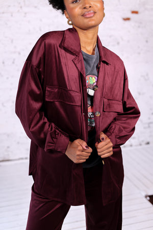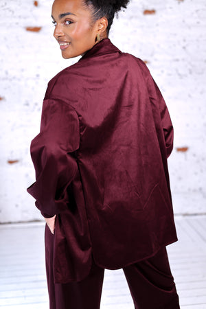 Chemise fluide à l’effet suédine bordeaux. Sa coupe oversize et son tombé élégant en font une pièce à la fois moderne et facile à porter, que ce soit en total look ou mixée avec un bas plus casual.