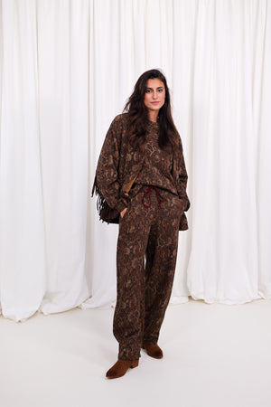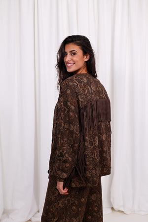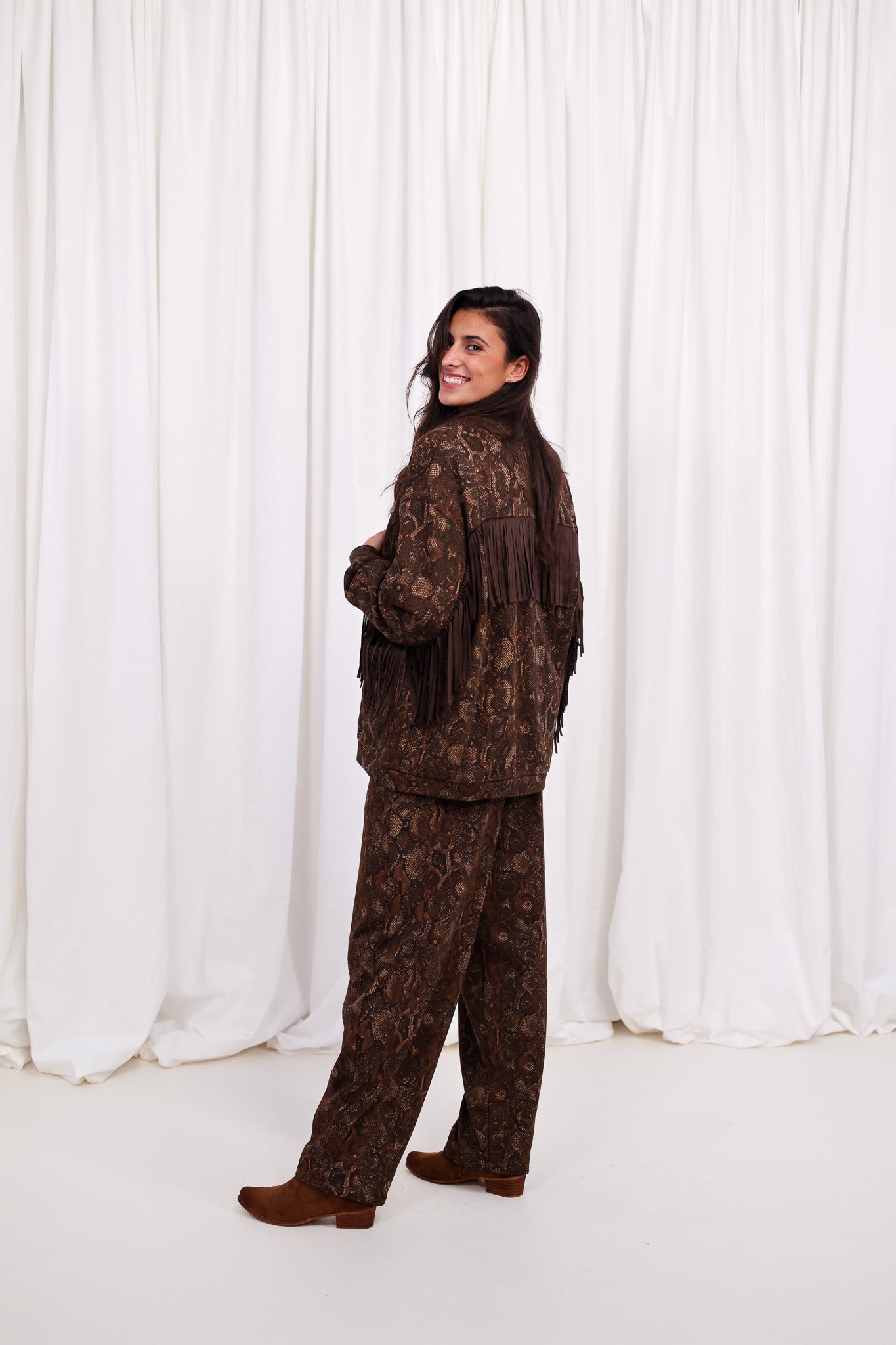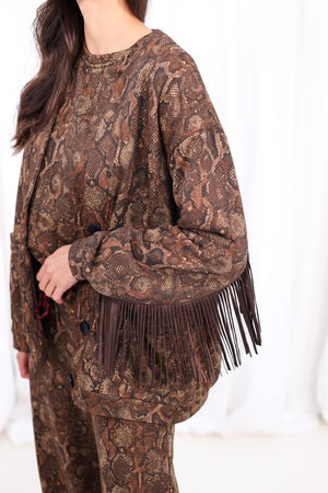 Ce gilet imprimé python est la pièce tendance idéale pour donner du caractère à toutes vos tenues. Léger, fluide et confortable, il reprend l’esprit western-bohème avec ses longues franges positionnées sur l’arrière et le long des manches, apportant mouvement et originalité à votre look.