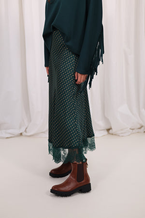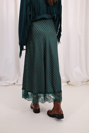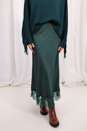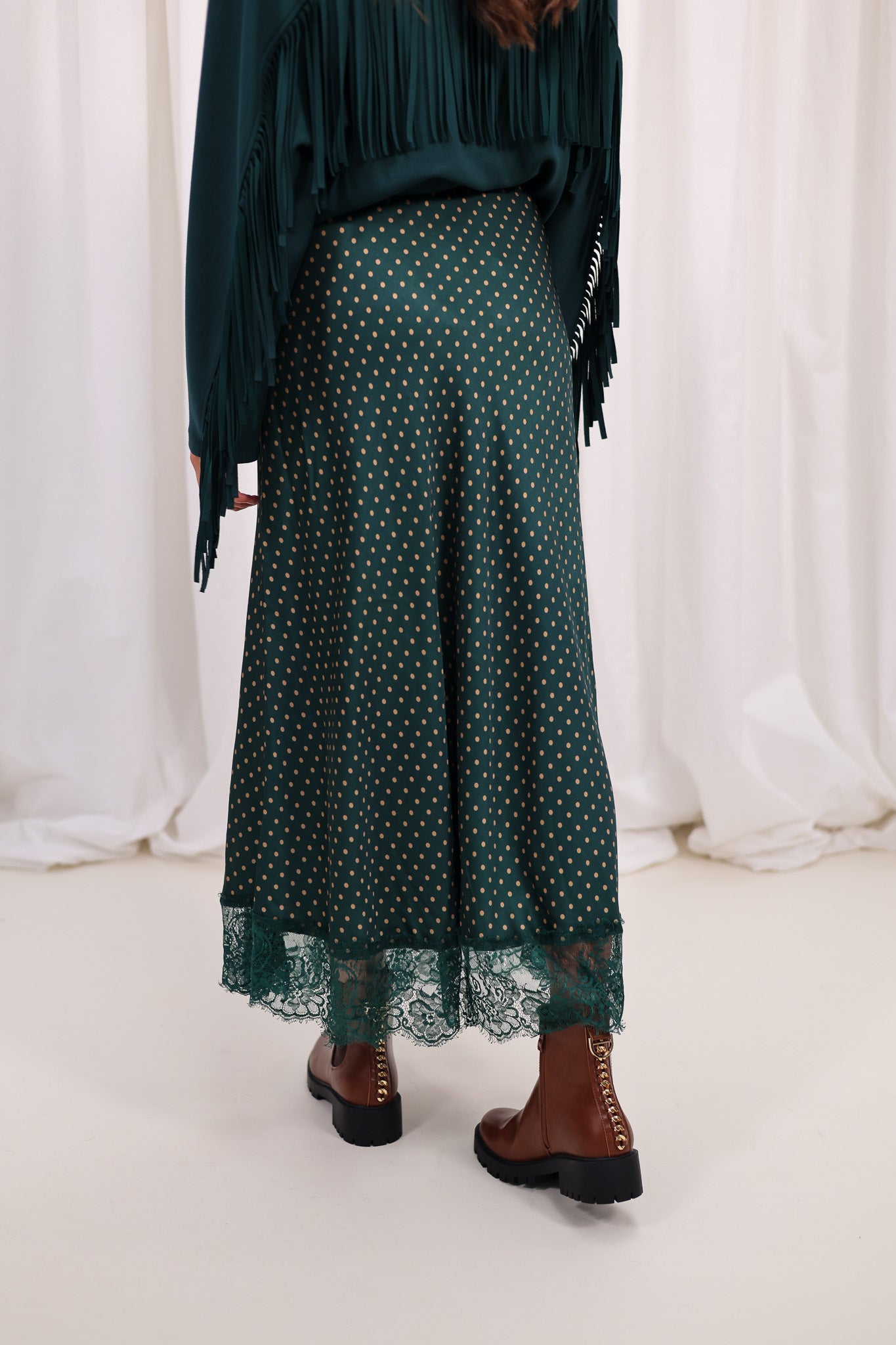 Pour équilibrer la douceur du look, voici la jupe parfaite : une jupe satinée vert émeraude à pois dorés, fluide, féminine et terriblement élégante.