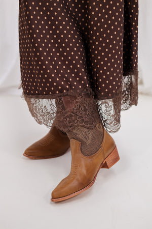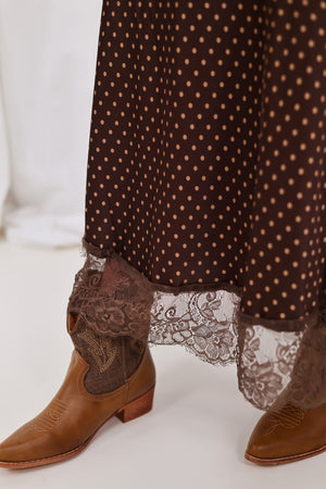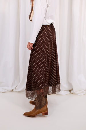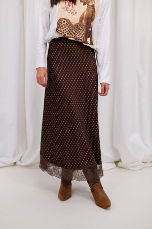 La pièce parfaite pour apporter une touche féminine et ultra fluide à un look : la jupe satinée chocolat, ornée d’une délicate bande de dentelle.