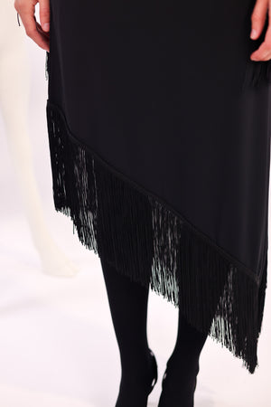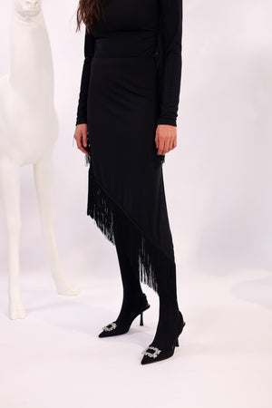 Cette jupe se distingue par sa coupe asymétrique prolongée d’une large rangée de franges, créant un effet de mouvement fluide et raffiné. Longue mais légère, elle allonge la silhouette tout en ajoutant une touche spectaculaire parfaitement adaptée aux soirées et événements habillés.