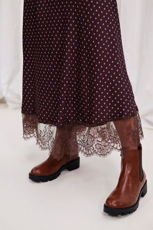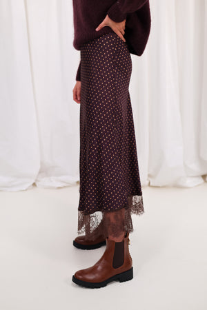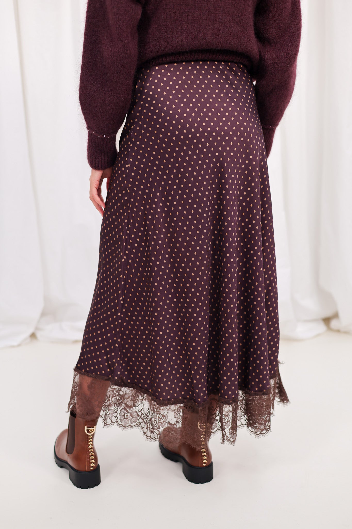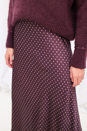 La jupe fluide à pois fait son grand retour, cette fois dans une teinte prune chocolatée chic et raffinée.