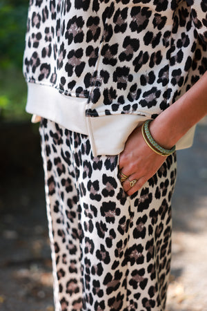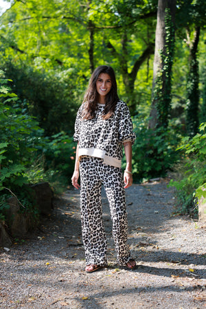 Adoptez un style affirmé avec ce pantalon fluide et léger à imprimé léopard. Il allie confort et modernité pour une allure chic sans effort. À porter seul ou en total look avec le sweat coordonné.