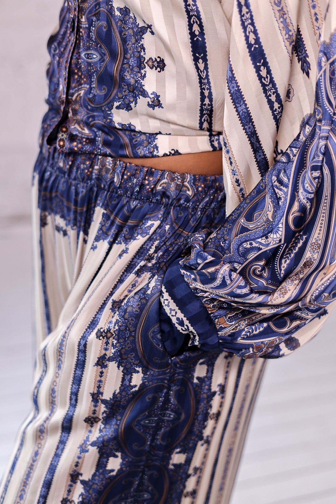 - Pantalon fluide imprimé bleu et beige