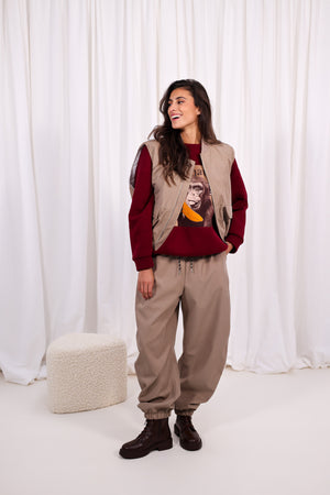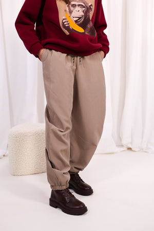 Sa taille élastiquée assure un maintien parfait et un grand confort au quotidien. La coupe légèrement ample lui donne une allure moderne et décontractée, tout en permettant une grande liberté de mouvement. Les bas resserrés ajoutent une touche sportive discrète et structurent l’ensemble.