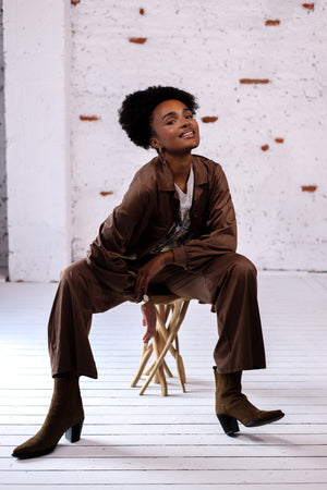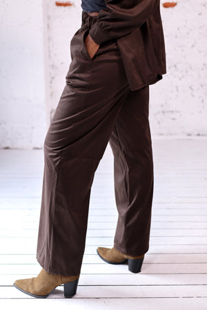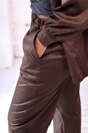 Pantalon fluide à l’effet suédine chocolat. Sa coupe ample et sa taille élastiquée garantissent confort et élégance. Un essentiel à adopter pour un look moderne et pratique au quotidien.