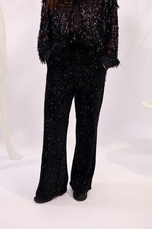 Sublimez vos tenues de soirée avec ce pantalon noir pailleté, une pièce glamour et tendance pensée pour allier confort et éclat. Entièrement recouvert de sequins ultra-brillants, il reflète la lumière avec intensité pour un rendu chic et spectaculaire.