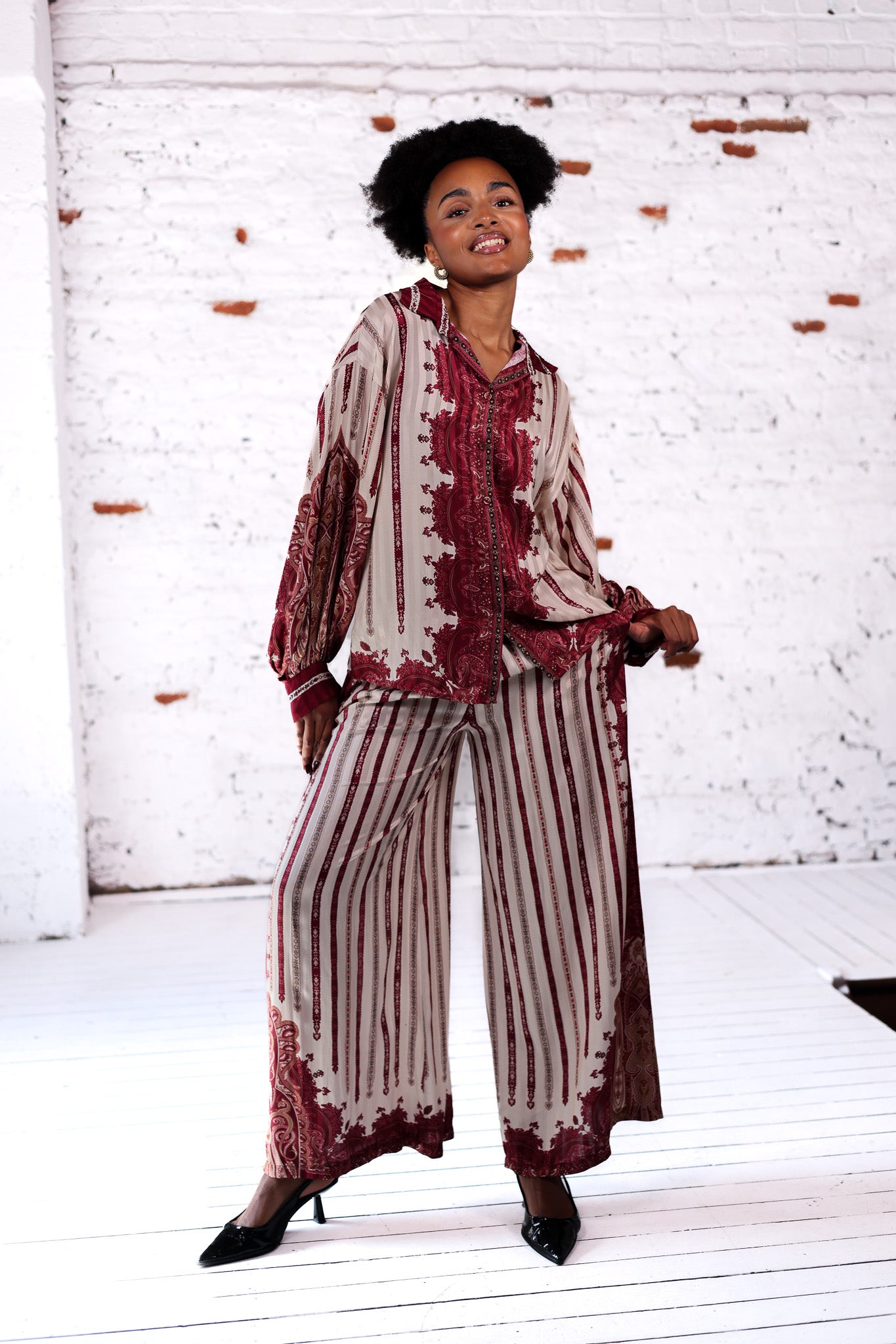 Ce pantalon fluide est un véritable allié confort et style. Son imprimé bordeaux et beige lui apporte une touche chic et tendance, tandis que sa coupe ample et sa taille élastiquée s’adaptent parfaitement aux silhouettes jusqu’au 42. À associer avec un haut sobre ou avec la chemise assortie pour un ensemble irrésistible.