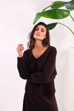 Un pull doux, chaud et ultra confortable, dans une sublime couleur chocolat profonde. Sa coupe féminine avec un joli décolleté en V apporte élégance et douceur. Grâce à sa matière haut de gamme riche en kid mohair et en laine mérinos, il offre un confort incomparable et un toucher délicat.