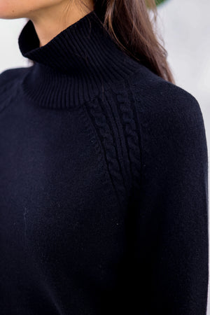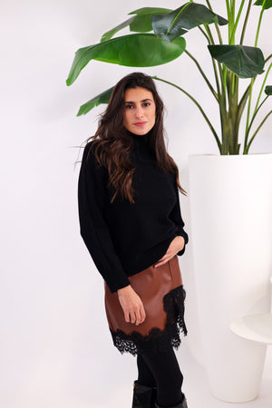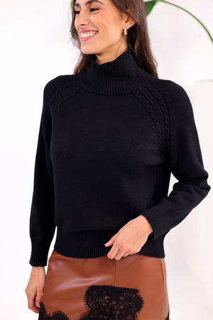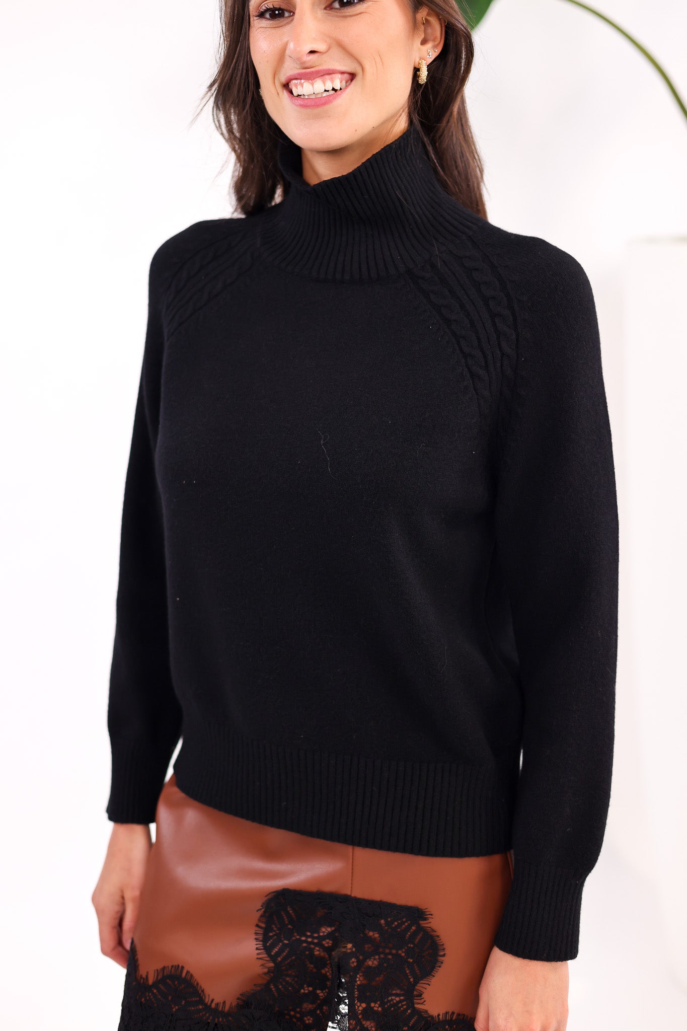Le pull noir parfait : chaud, doux, bien coupé, avec de jolis détails torsadés sur les épaules. Sa coupe confortable et son col roulé apportent élégance et chaleur. Un indispensable du dressing d’hiver.