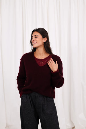 On continue dans le cocooning chic avec ce pull col V en maille douce, dont la couleur bordeaux profonde sublime instantanément toutes les carnations.