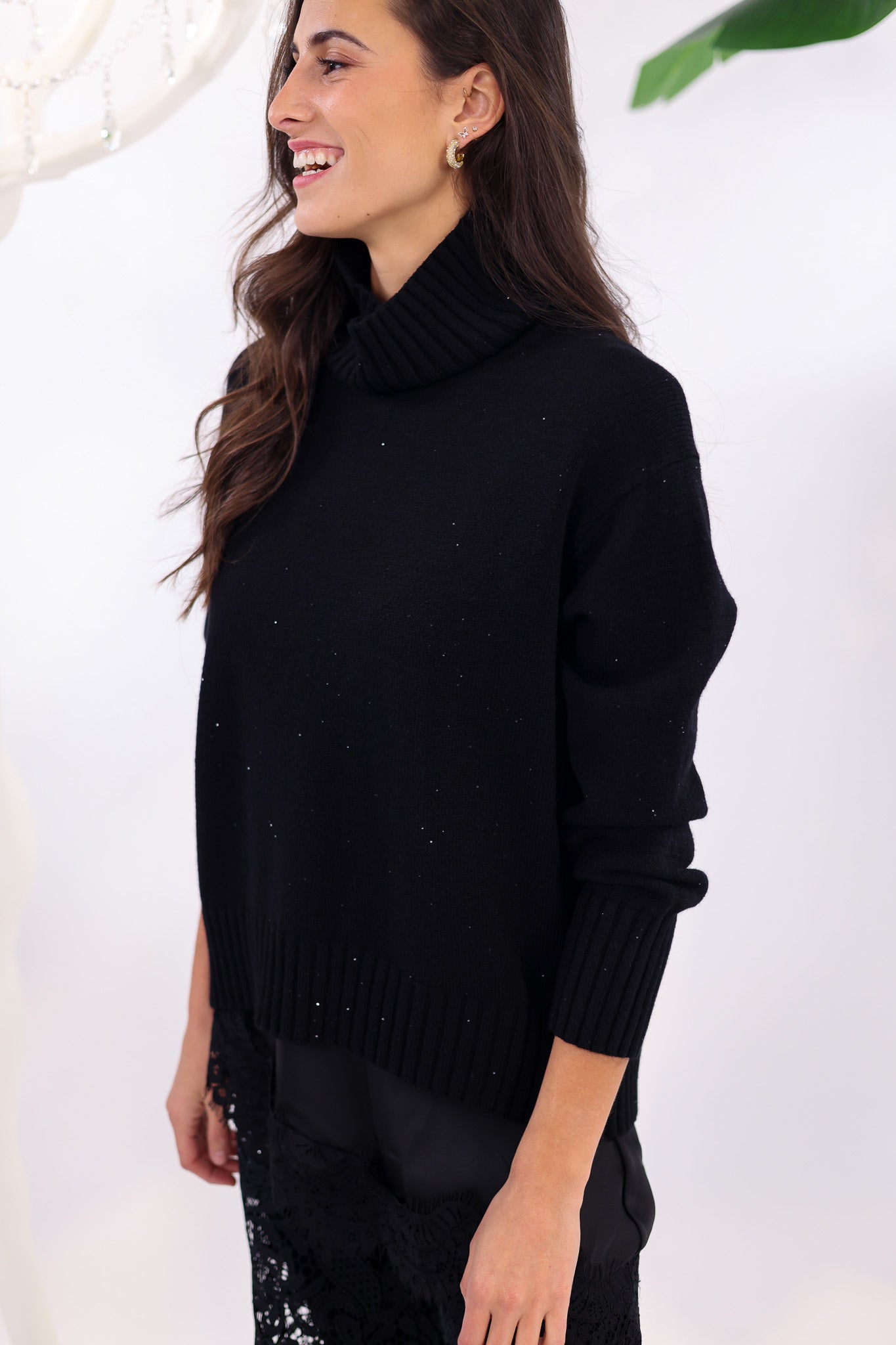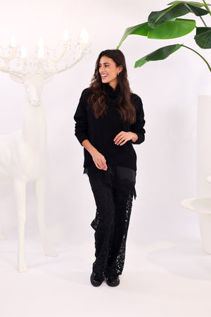 Ce pull noir à col roulé est la pièce cosy et élégante parfaite pour la saison. Sa maille toute douce, sans laine, offre un confort optimal même pour les peaux sensibles. Sa coupe légèrement oversize lui permet de convenir jusqu’au 42/44, tout en gardant une silhouette moderne et harmonieuse.