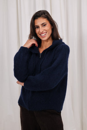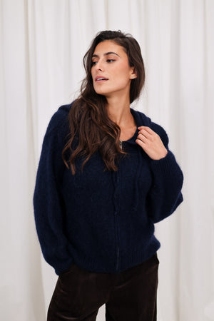 Un gilet zippé tout doux, avec une jolie tirette métallique qui apporte la touche moderne qu’on adore. Sa couleur bleu nuit est chic, lumineuse et hyper facile à associer.