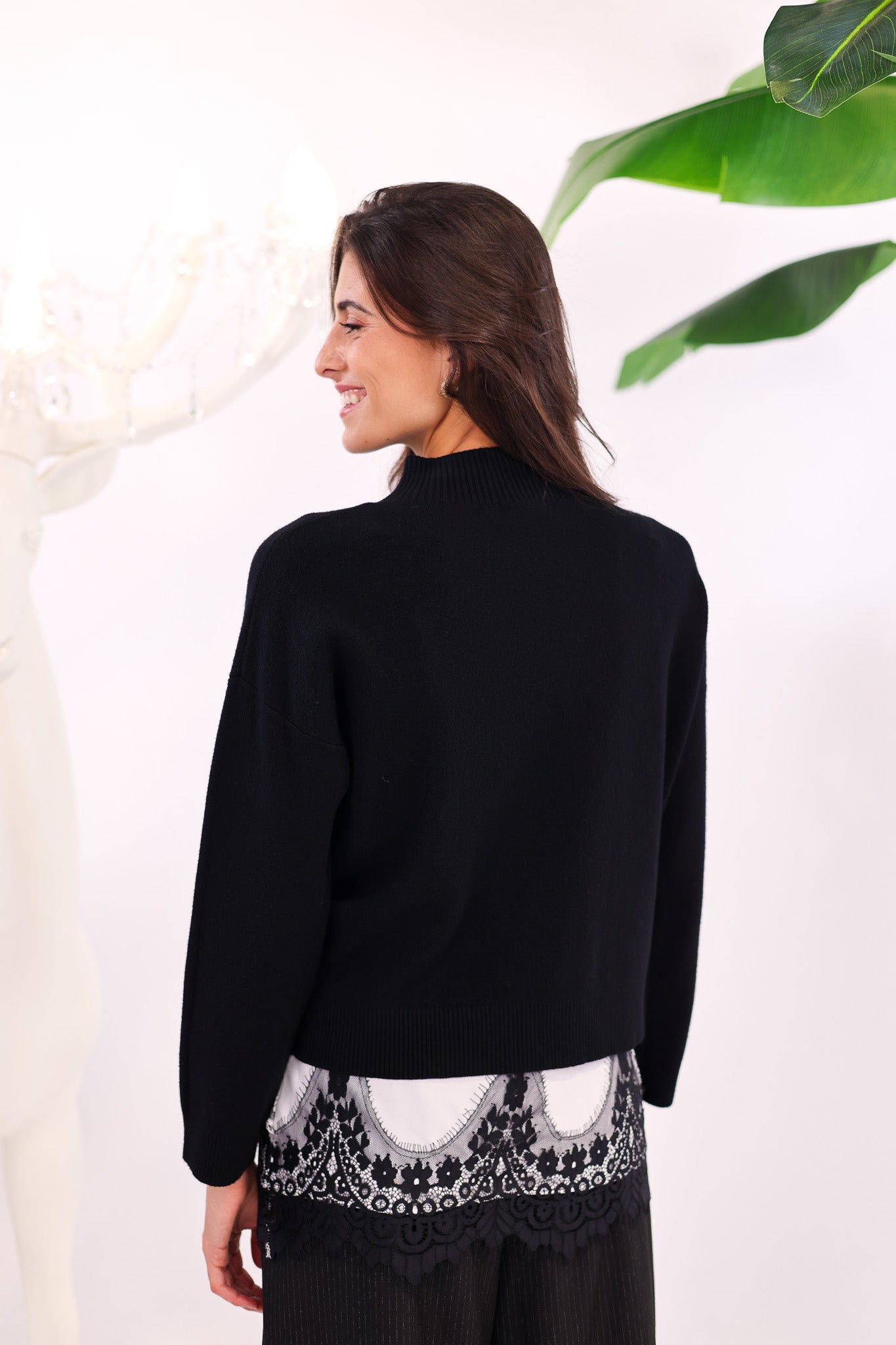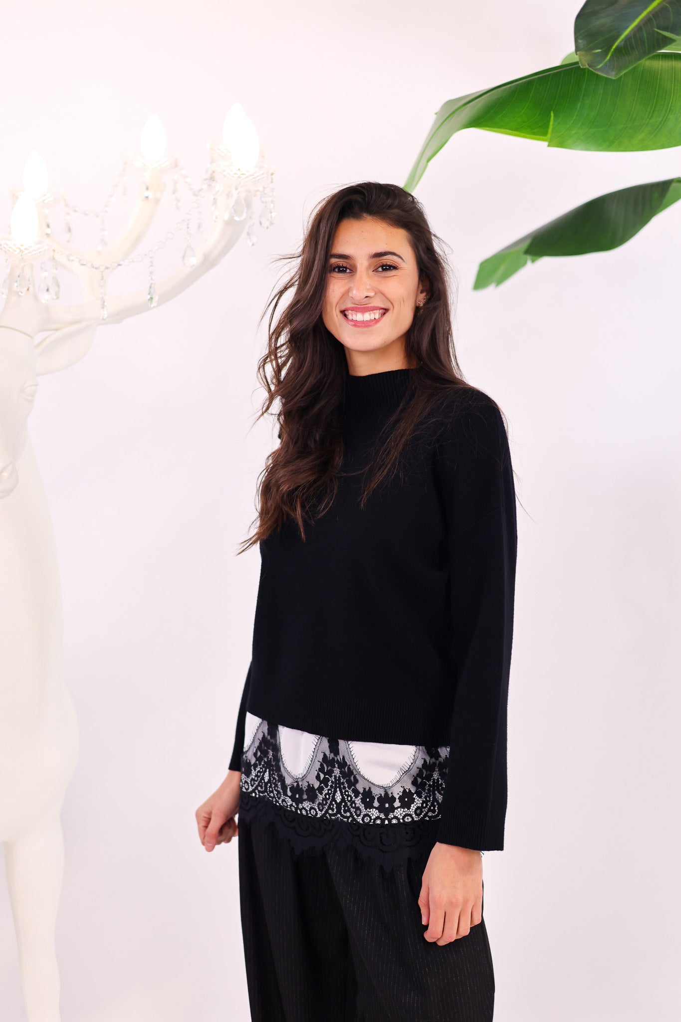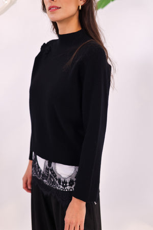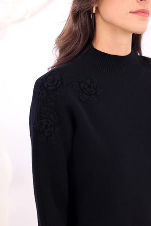 Ce pull se distingue par ses détails floraux délicats sur les manches, qui ajoutent une note subtilement sophistiquée et originale à un classique indémodable. Sa coupe droite et fluide assure confort et liberté de mouvement, idéale pour des looks casual ou habillés selon vos envies.