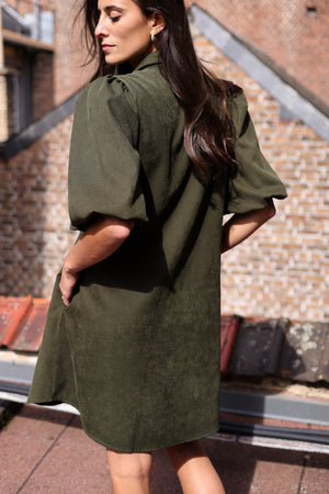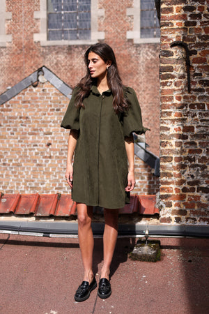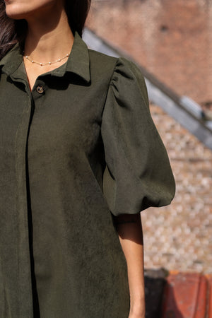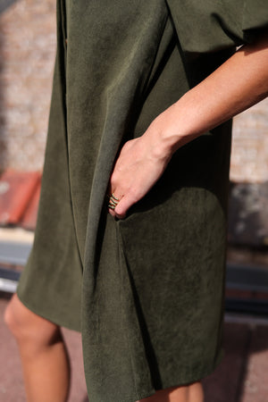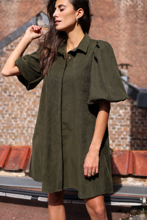 La robe velour séduit par sa coupe évasée et son allure élégante. Avec son col chemise et ses manches courtes bouffantes, elle combine confort et tendance. Fluide et facile à porter, elle apporte une touche moderne et féminine en toutes circonstances. Déclinée en kaki, coloris intemporel, c’est une robe versatile qui se porte aussi bien avec des bottines en automne qu’avec des baskets.