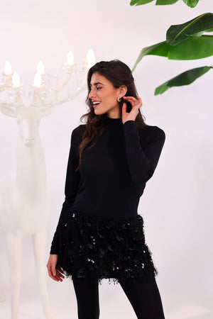 Cette robe se distingue par sa jupe brillante qui donne instantanément un look chic, moderne et captivant, parfaite pour les fêtes de fin d’année ou toute soirée où vous souhaitez briller.