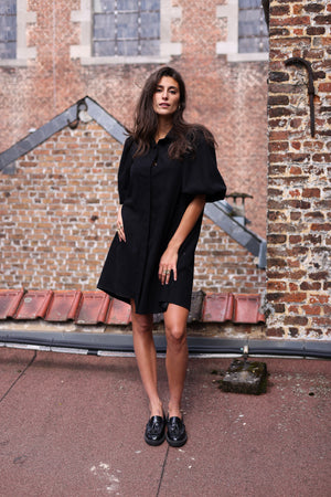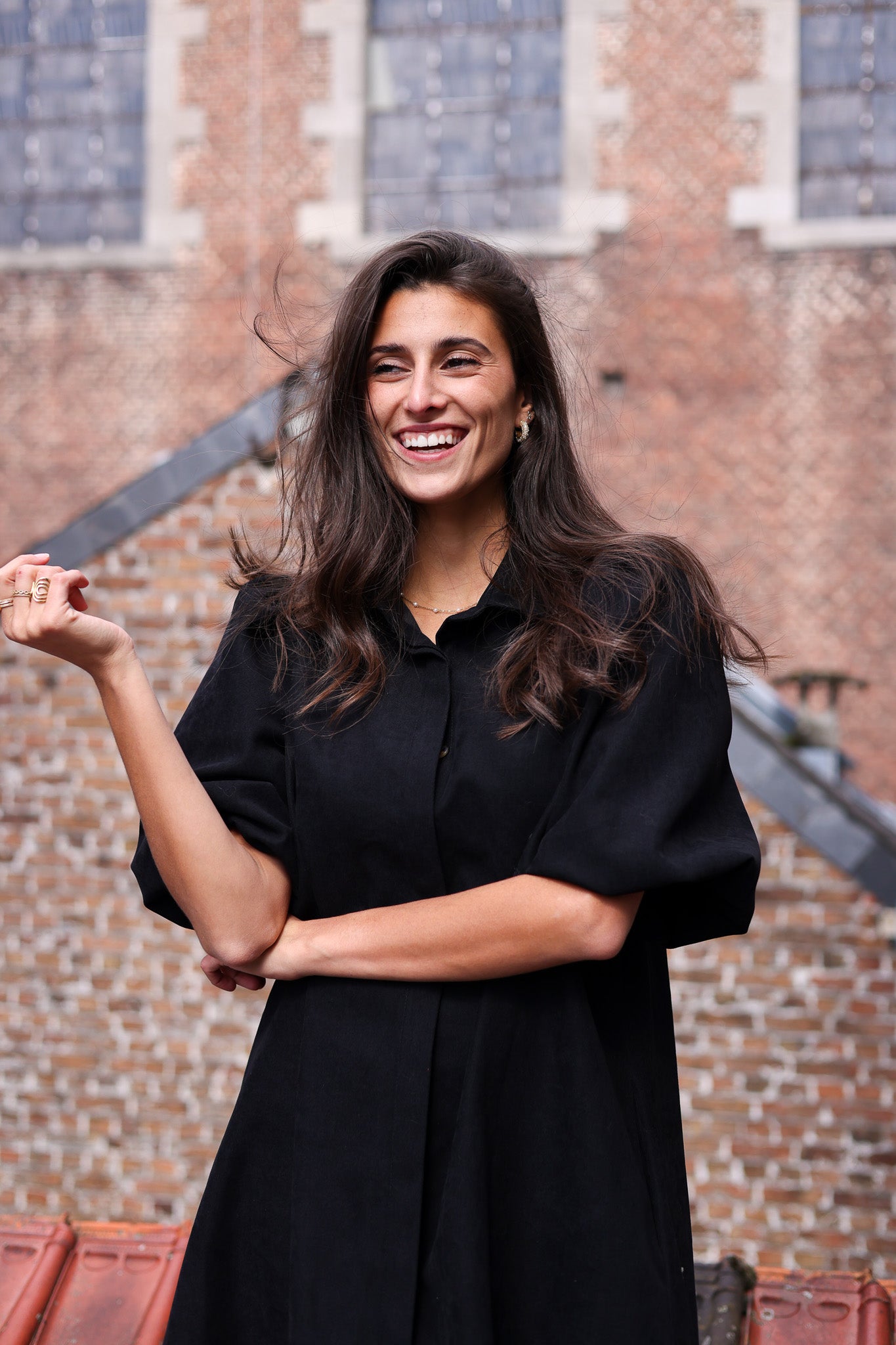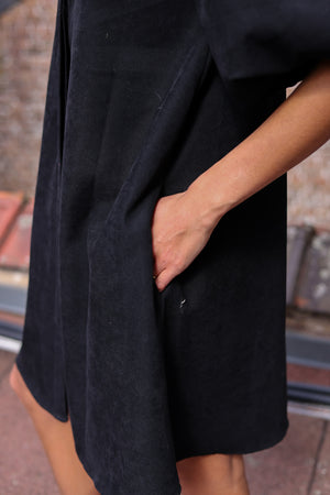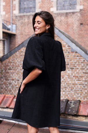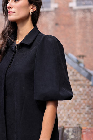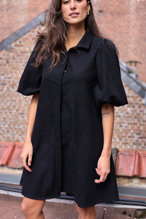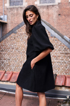 La robe velour séduit par sa coupe évasée et son allure élégante. Avec son col chemise et ses manches courtes bouffantes, elle combine confort et tendance. Fluide et facile à porter, elle apporte une touche moderne et féminine en toutes circonstances. Déclinée en noir, coloris intemporel, c’est une robe versatile qui se porte aussi bien avec des bottines en automne qu’avec des baskets.