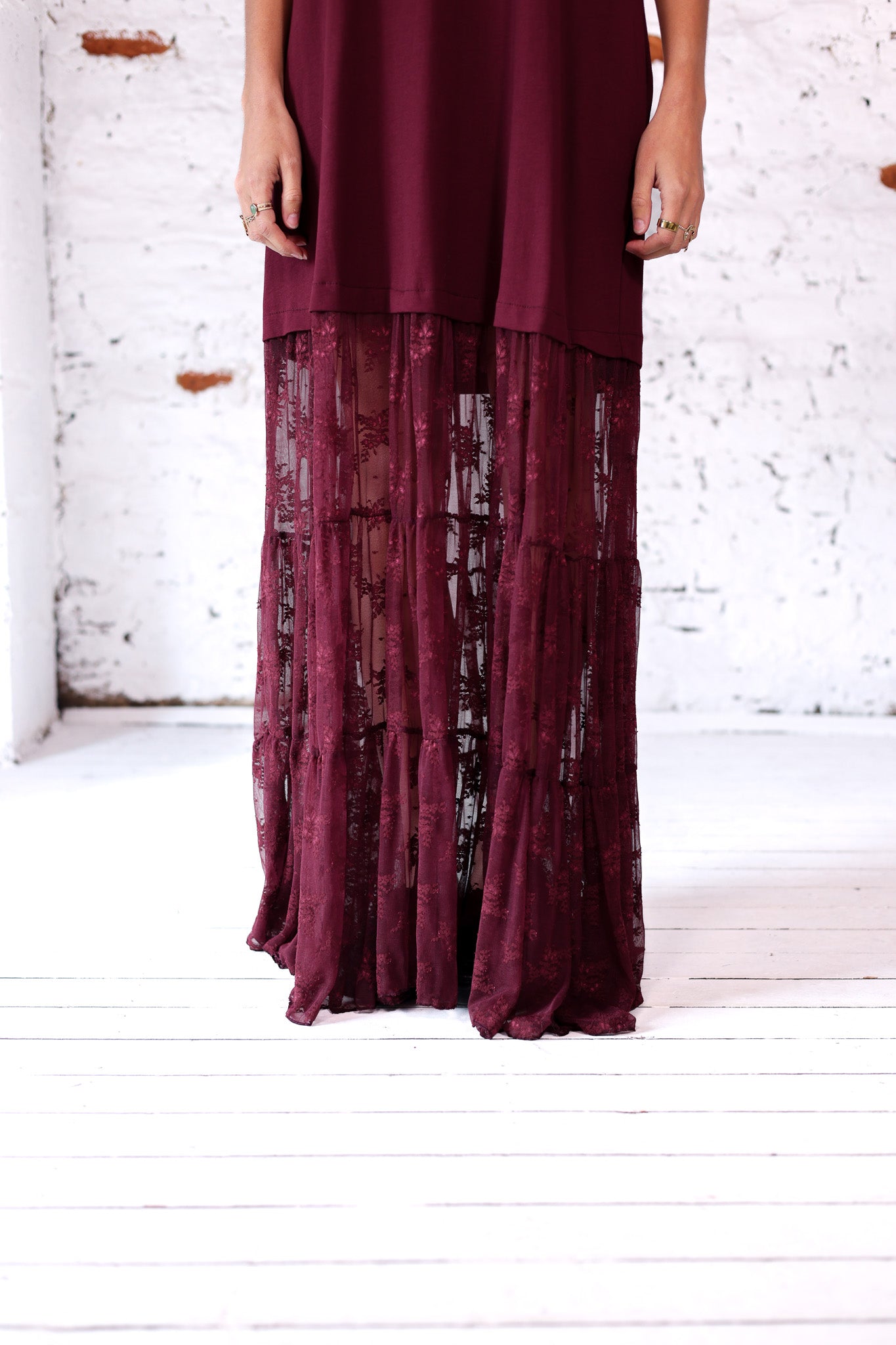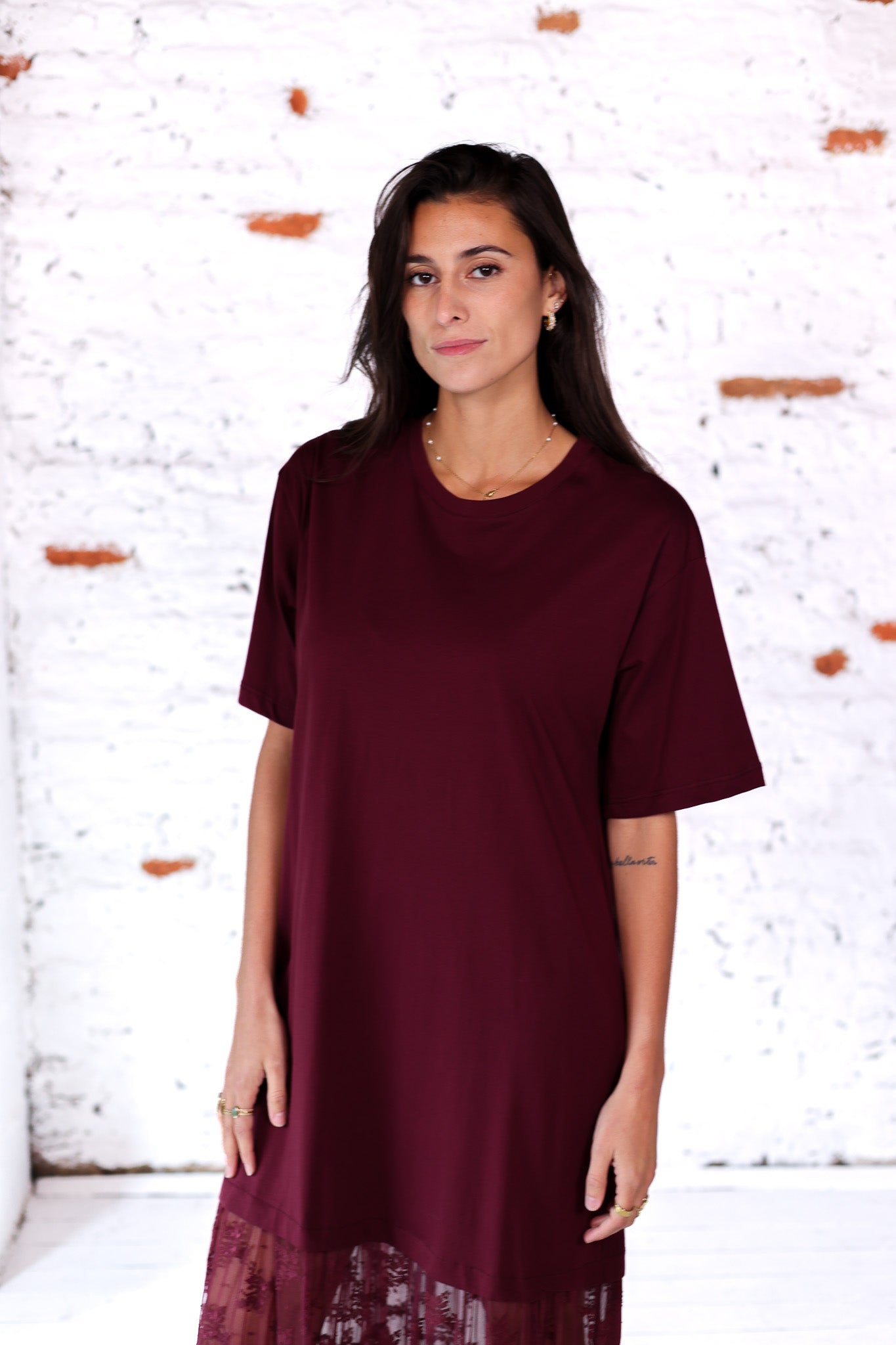 La robe longue oversize bordeaux apporte une touche de couleur raffinée à vos tenues. Sa coupe ample et son bas en dentelle apportent fluidité et élégance. La couleur bordeaux, profonde et féminine, sublime toutes les œillets.
