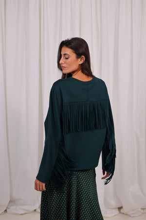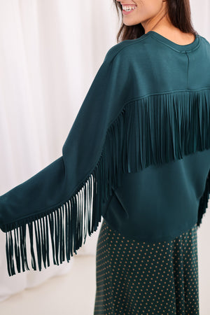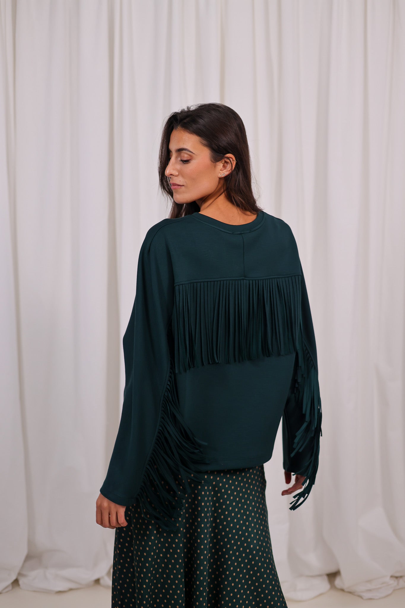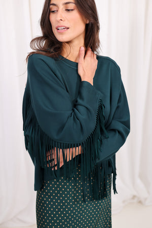 Place au coup de cœur vibrant du look : le sweat émeraude frangé, pensé pour celles qui aiment affirmer leur style tout en restant 100 % à l’aise.