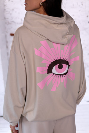 Pièce forte et originale, ce hoodie oversize beige séduit par son confort et son style unique. Orné d’un imprimé œil rose lumineux à l’avant et dans le dos, il donne du caractère à vos looks tout en restant facile à porter au quotidien. Une coupe ample qui convient à toutes les morphologies, pour un effet décontracté ultra-tendance.