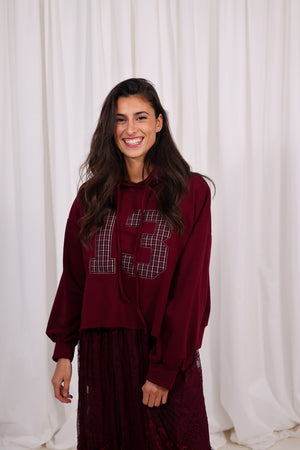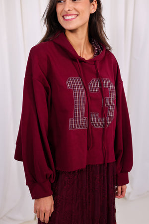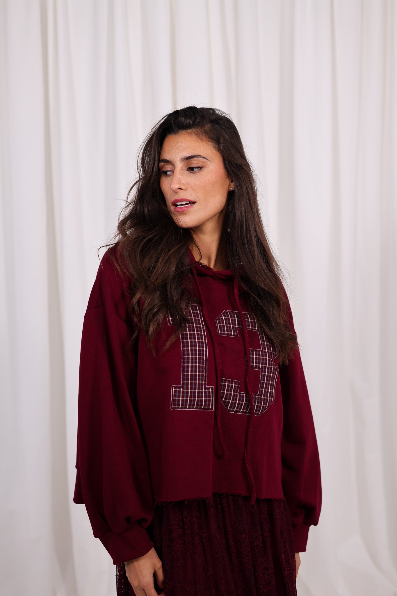 Son bordeaux profond donne immédiatement du caractère à la silhouette, tandis que le grand numéro 13 en tissu carreaux (tons prune et écru) apporte la touche graphique qui rend ce sweat unique. Un joli clin d’œil au style campus, revisité en version féminine et moderne.