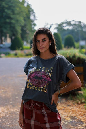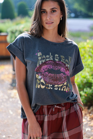 Affichez un style audacieux avec ce tee-shirt gris délavé orné d’un imprimé lèvres pailletées et du message “Rock & Roll Rock Star” en lettres dorées. Sa coupe loose et ses manches retroussées donnent une allure décontractée mais affirmée. Parfait à porter rentré dans un jean ou un pantalon fluide pour un look casual chic.
