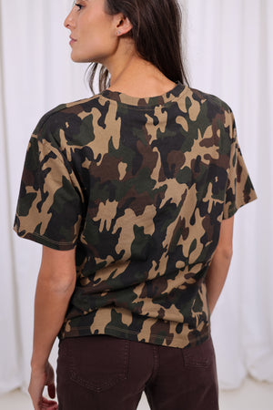 Un t-shirt au look affirmé et plein d’attitude, avec son imprimé camouflage et son inscription brodée sur la poitrine.