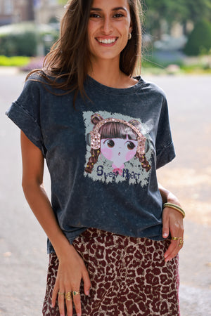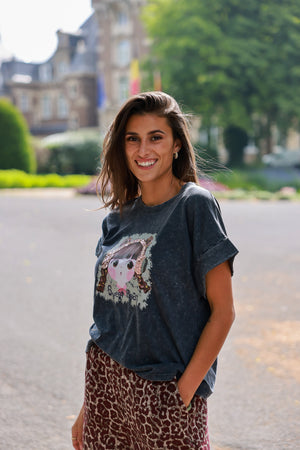 Ajoute une touche cool à ta tenue avec ce t-shirt à imprimé original. En coton doux, légèrement délavé, il joue sur l’esprit casual et rock à la fois. Parfait pour casser un look trop sage ou apporter du caractère à un ensemble coordonné.