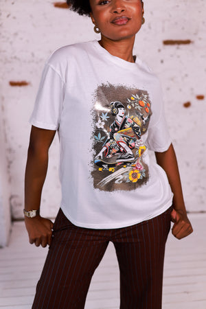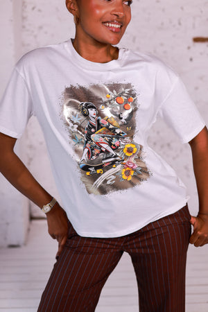 Optez pour un look original et tendance avec ce t-shirt blanc en coton, orné d’un imprimé exclusif « Geisha Skater ». Entre tradition et modernité, le motif mêle l’élégance d’un kimono japonais à l’énergie streetwear d’un skateboard, sublimé par des touches fleuries et dorées. Confortable et respirant, ce t-shirt oversize à coupe décontractée est idéal pour affirmer votre style avec audace.
