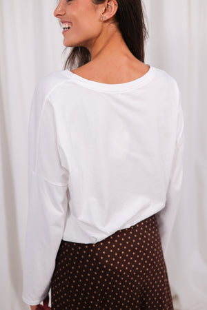 On commence fort avec ce t-shirt coupe oversize, un peu ample, terriblement cool, avec des manches longues et encolure légèrement élargie pour une allure ultra détendue.