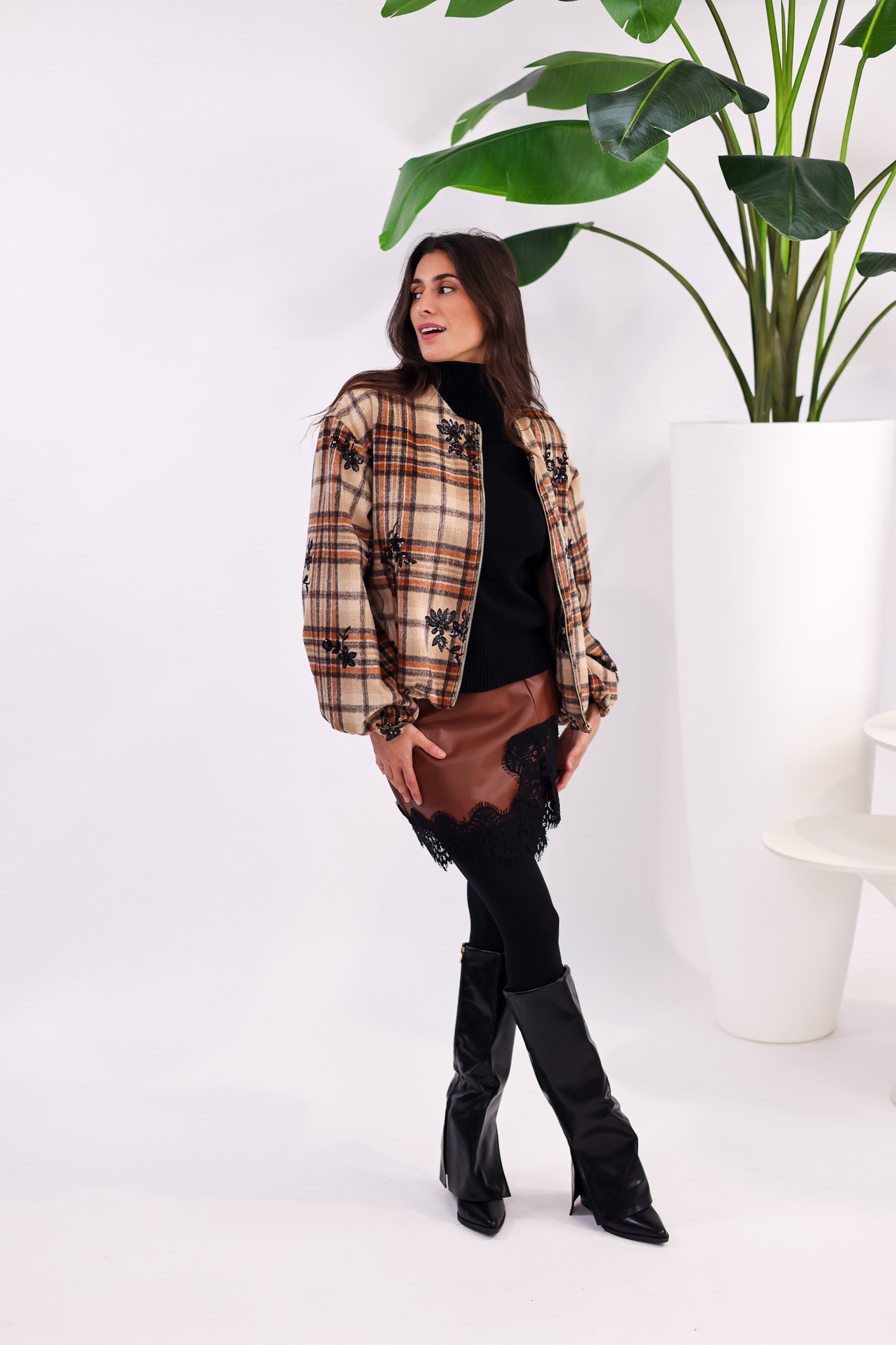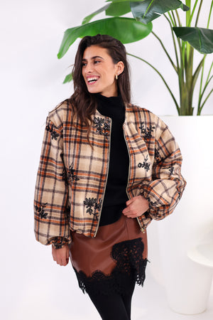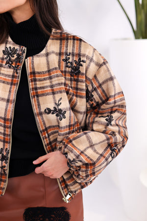 Un bombers canon et ultra tendance, avec un motif carreaux beige/camel sublimé par des broderies noires. Sa coupe légèrement bouffante et sa fermeture zippée en font une pièce mode et facile à porter. Parfaite pour styliser une tenue simple ou compléter un look chic.