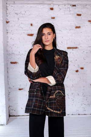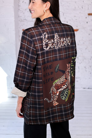 Une veste qui mêle originalité et caractère sauvage. Sur un motif carreaux brun classique viennent s’ajouter des broderies fantaisie (ours, fleurs, patchs colorés) et un majestueux léopard imprimé au dos accompagné du mot “Believe” et de l’inscription “The Wild Life”. Une pièce forte et inspirante qui affirme le style.