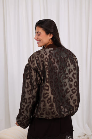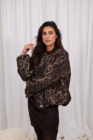 Voici la pièce forte du look : un bombers chocolat à imprimé léopard, aussi doux que stylé.